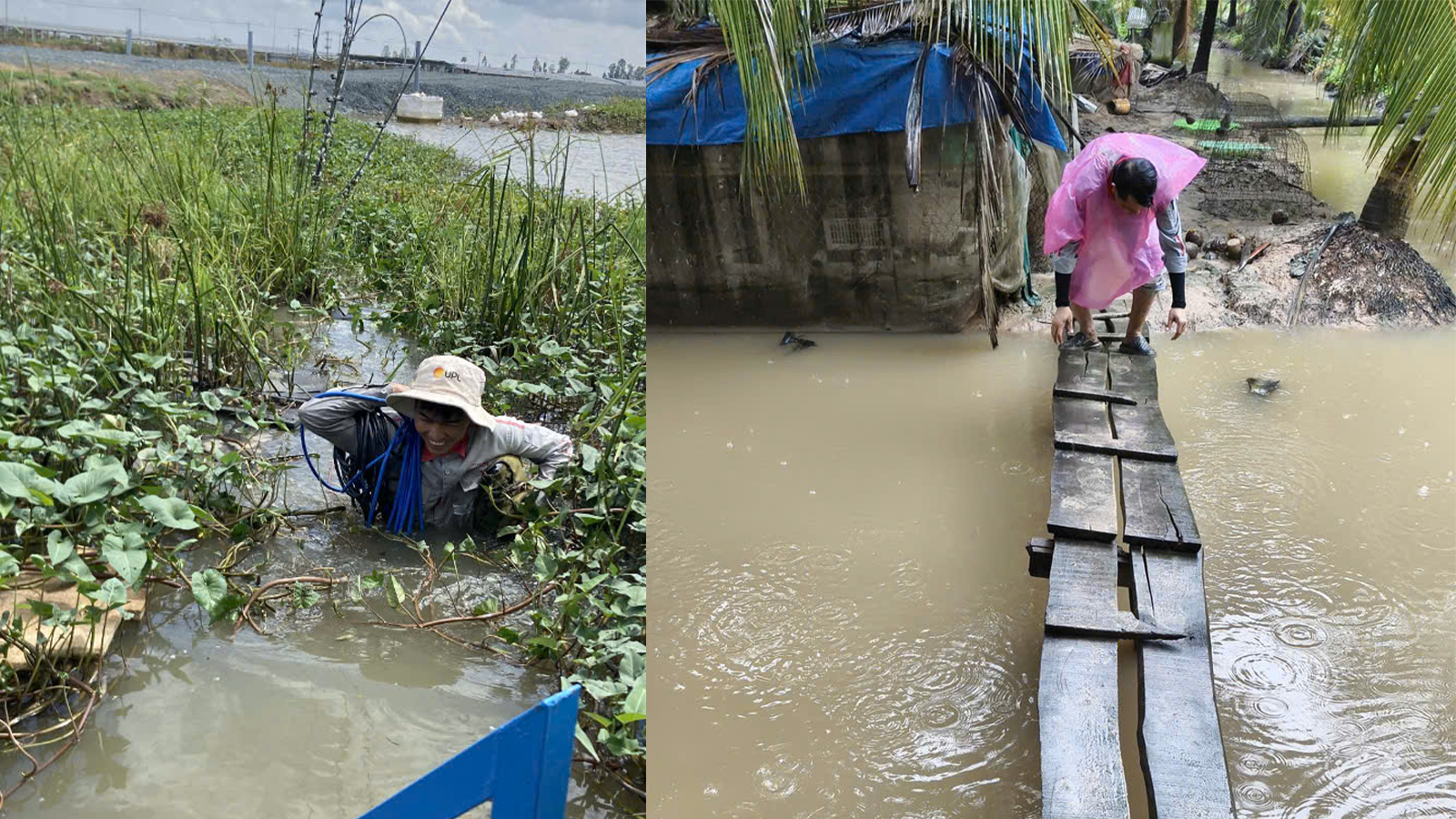 Những trạm khó nằm giữa đồng sâu hay giáp sông rạch, các anh sẵn sàng lội ruộng, lội nước, đầm mình để vận chuyển thiết bị tiếp cận trạm. Cầu tạm, đường đất, đường bùn, đường qua sông… địa hình nào cũng không thể cản bước.