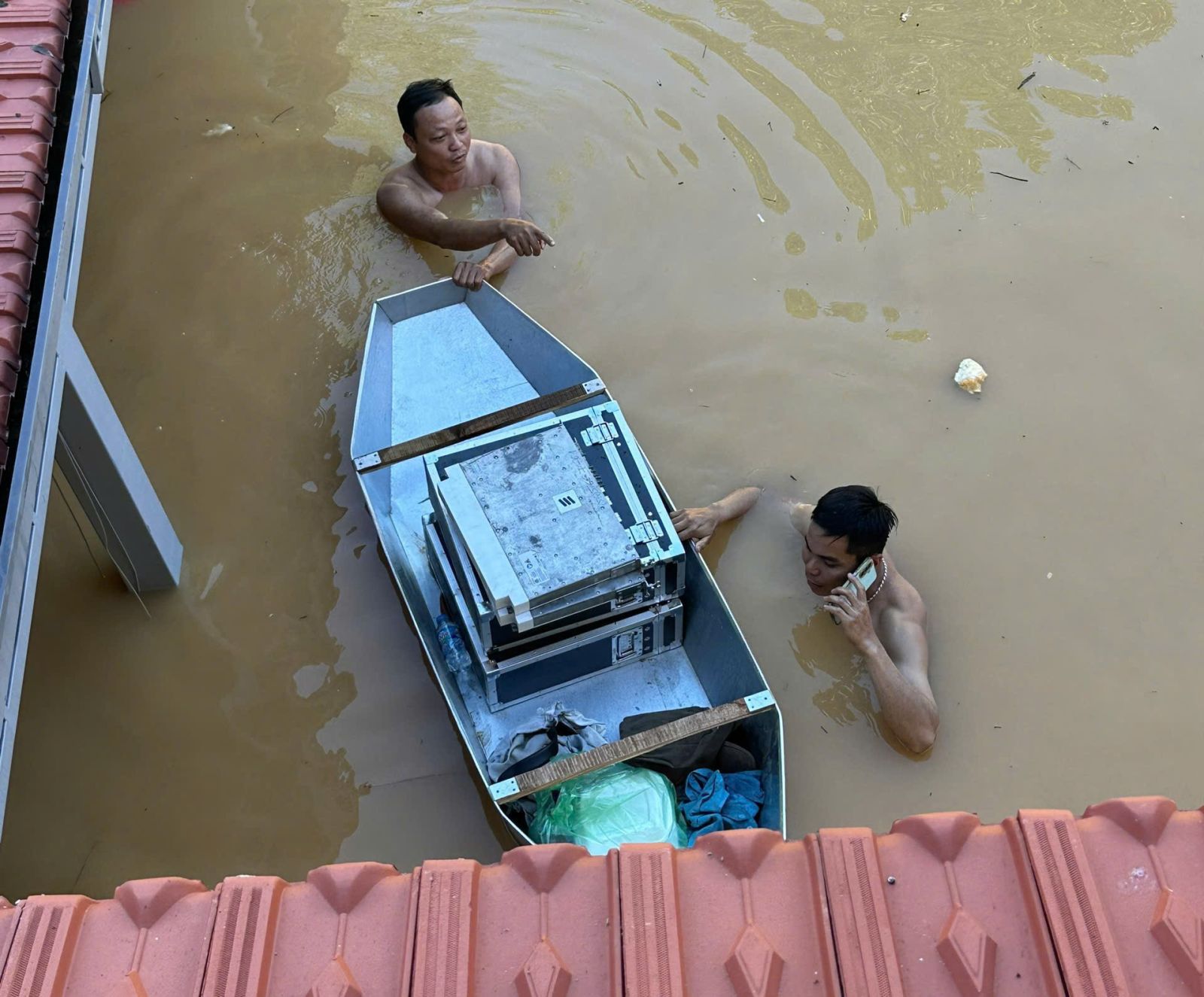 Xe chỉ đi được hơn một cây số thì đành dừng lại vì nước ngập sâu. Chiếc thuyền tôn mỏng manh chở các thiết bị nặng hàng chục ký đã được anh thuê lại của người dân lúc này trở thành giải pháp cứu cánh. Rồi sau đó anh Hiển, anh Được chẳng ngần ngại điều gì, đưa thiết bị cẩn thận lên thuyền sau đó người kéo, người đẩy thuyền.